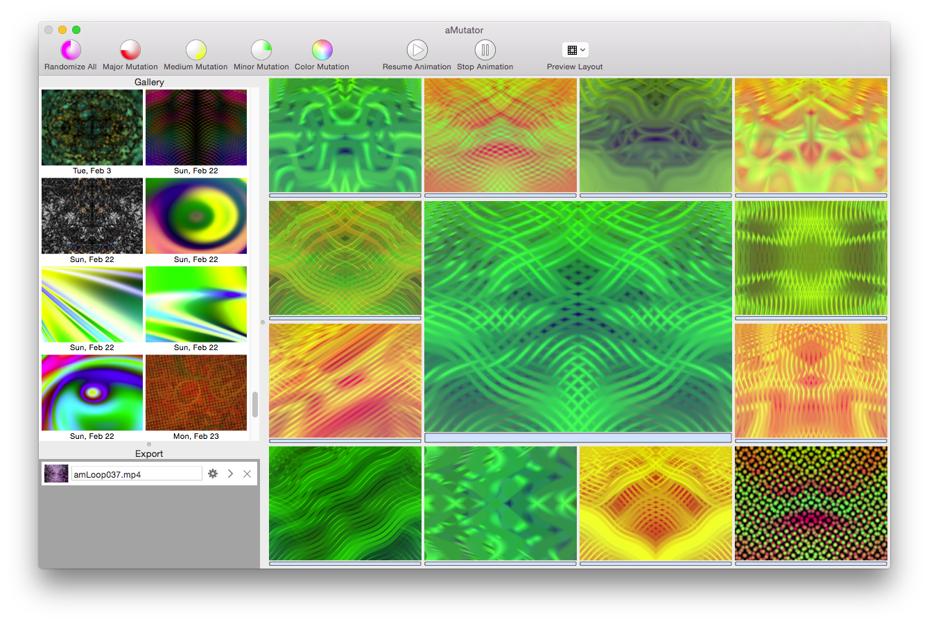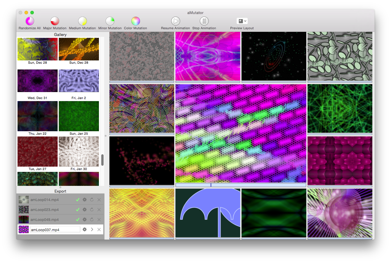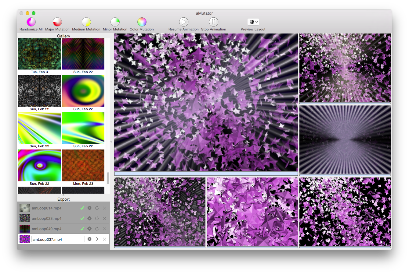 aMutator can generate video loops randomly, or can make variations (mutations) of selected video loop to help you find a desired variant.