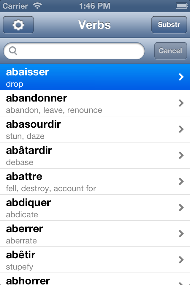 Our search function allows you to search not only for the string the verb begins from, but also for any string within the verb, giving you the extra search power.